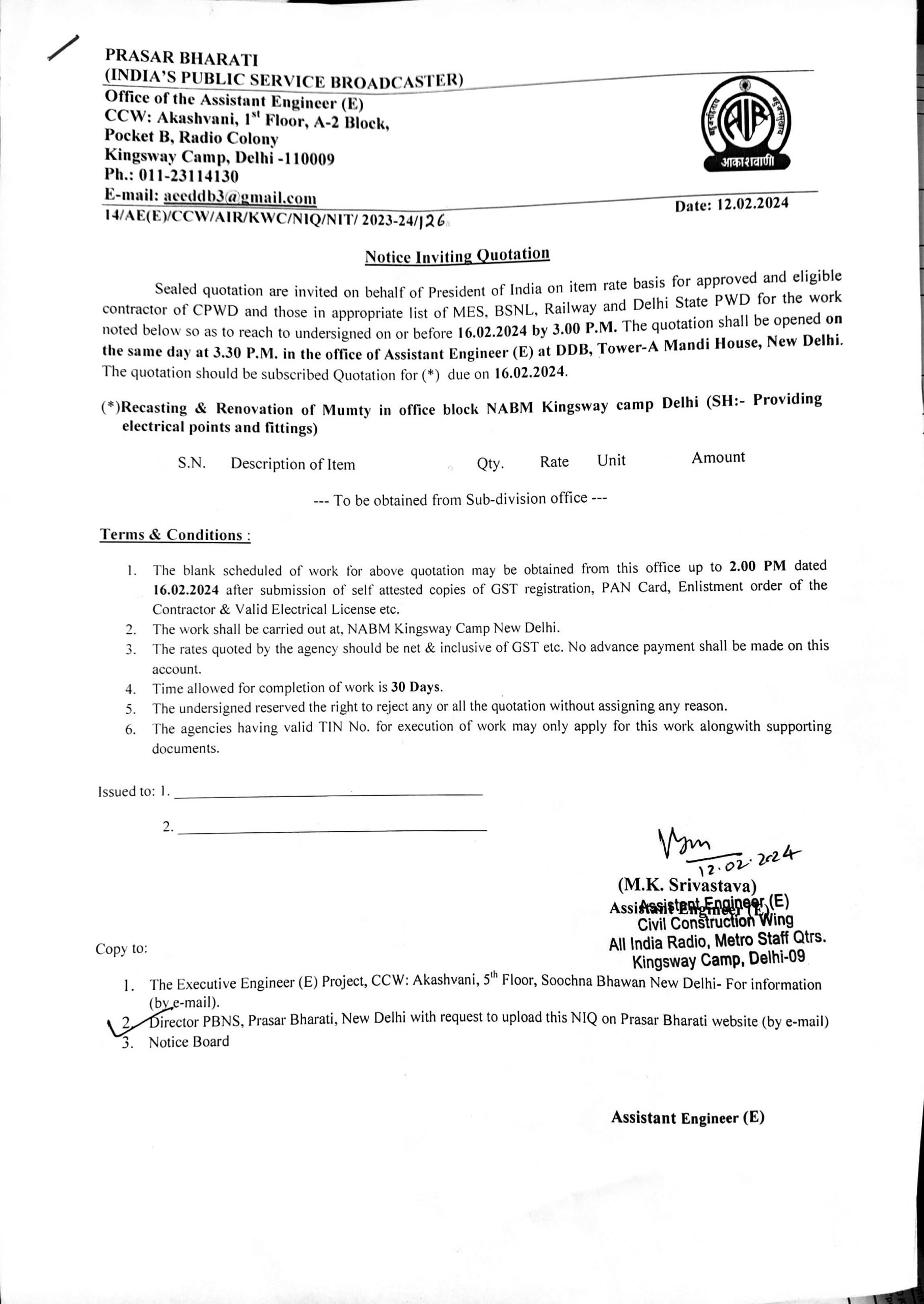 Recasting & Renovation of Mumty in office block NABM Kingsway camp Delhi (SH:- Providing electrical points and fittings) CCW: AIR Kingsway Camp Delhi Engineering 14/AE(E)/CCW/AIR/KWC/NIQ/NIT/2023-24/126 Recasting & Renovation of Mumty in office block NABM Kingsway camp Delhi (SH:- Providing electrical  points and fittings)