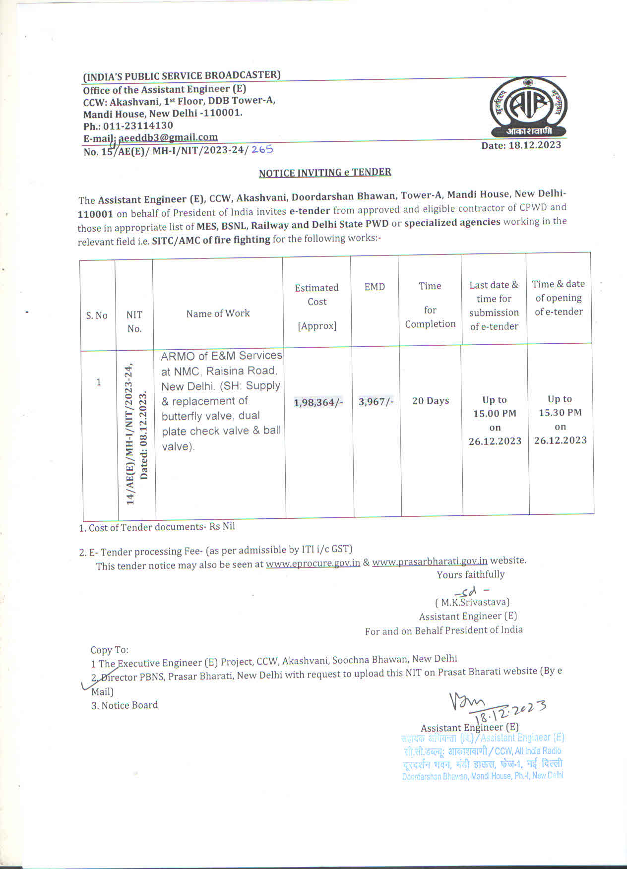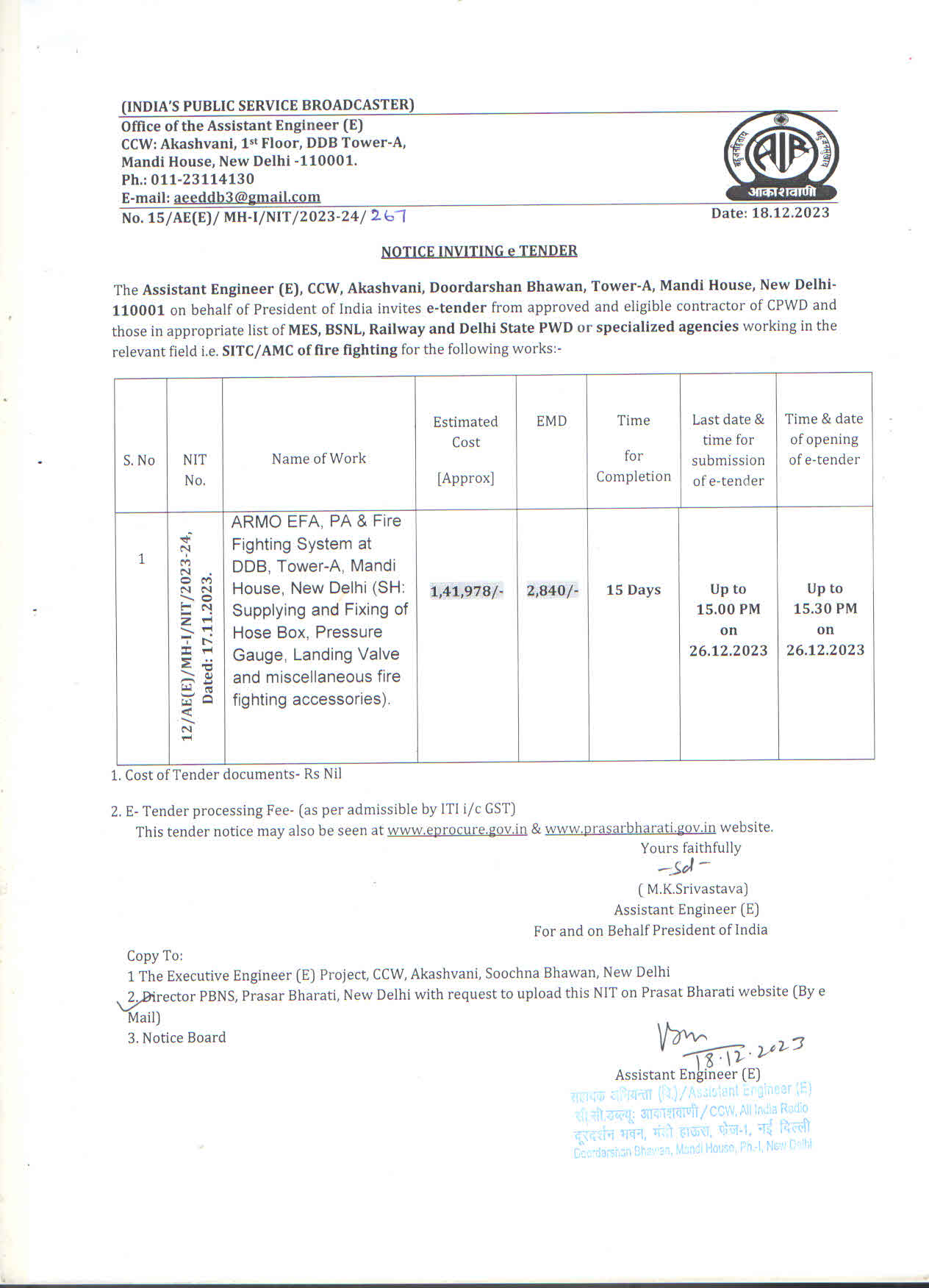 | ARMO EFA, PA & Fire Fighting System at DDB, Tower-A, Mandi House, New Delhi (SH: Supplying and Fixing of Hose Box, Pressure Gauge, Landing Valve and miscellaneous fire fighting accessories |