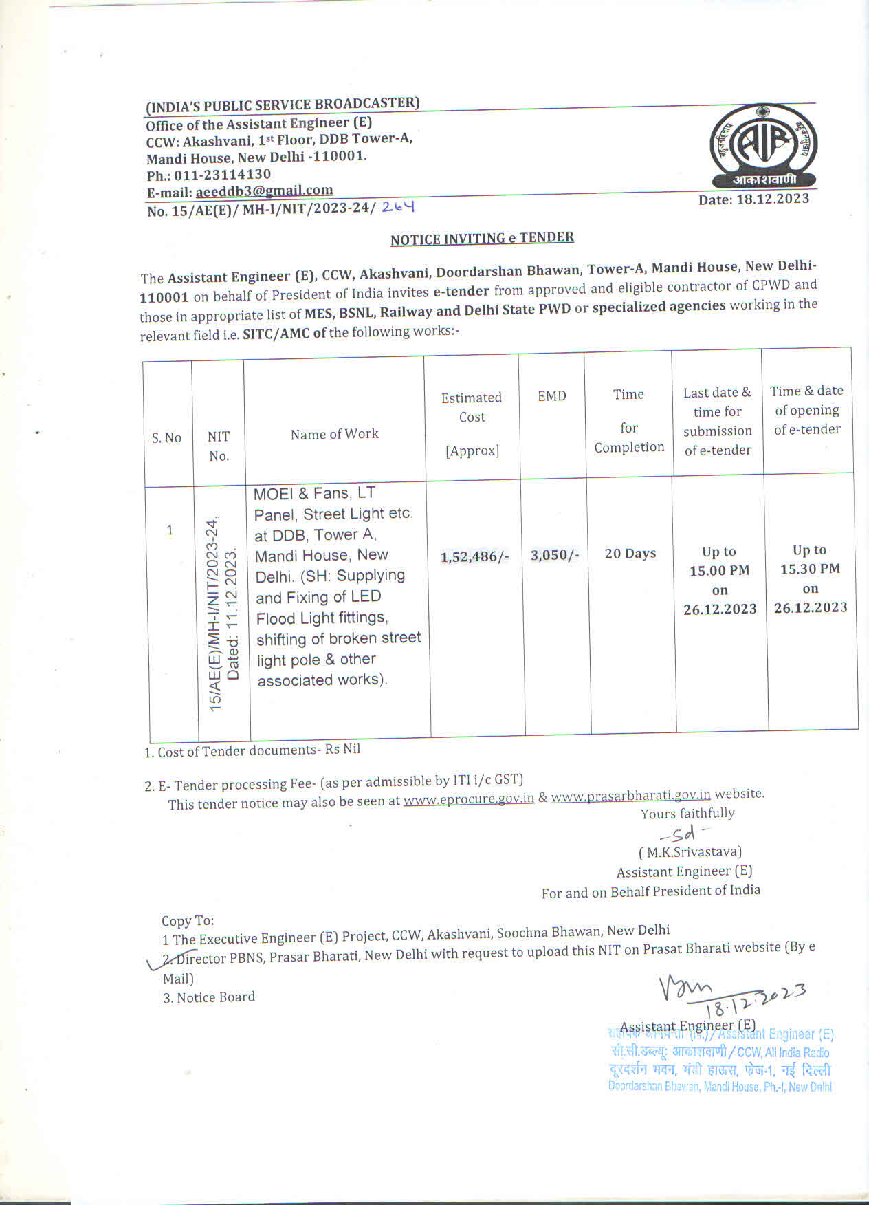 | MOEI & Fans, LT Panel, Street Light etc. at DDB, Tower A, Mandi House, New Delhi. (SH: Supplying and Fixing of LED Flood Lights fitting, shifting of broken street light pole & other associated works) |