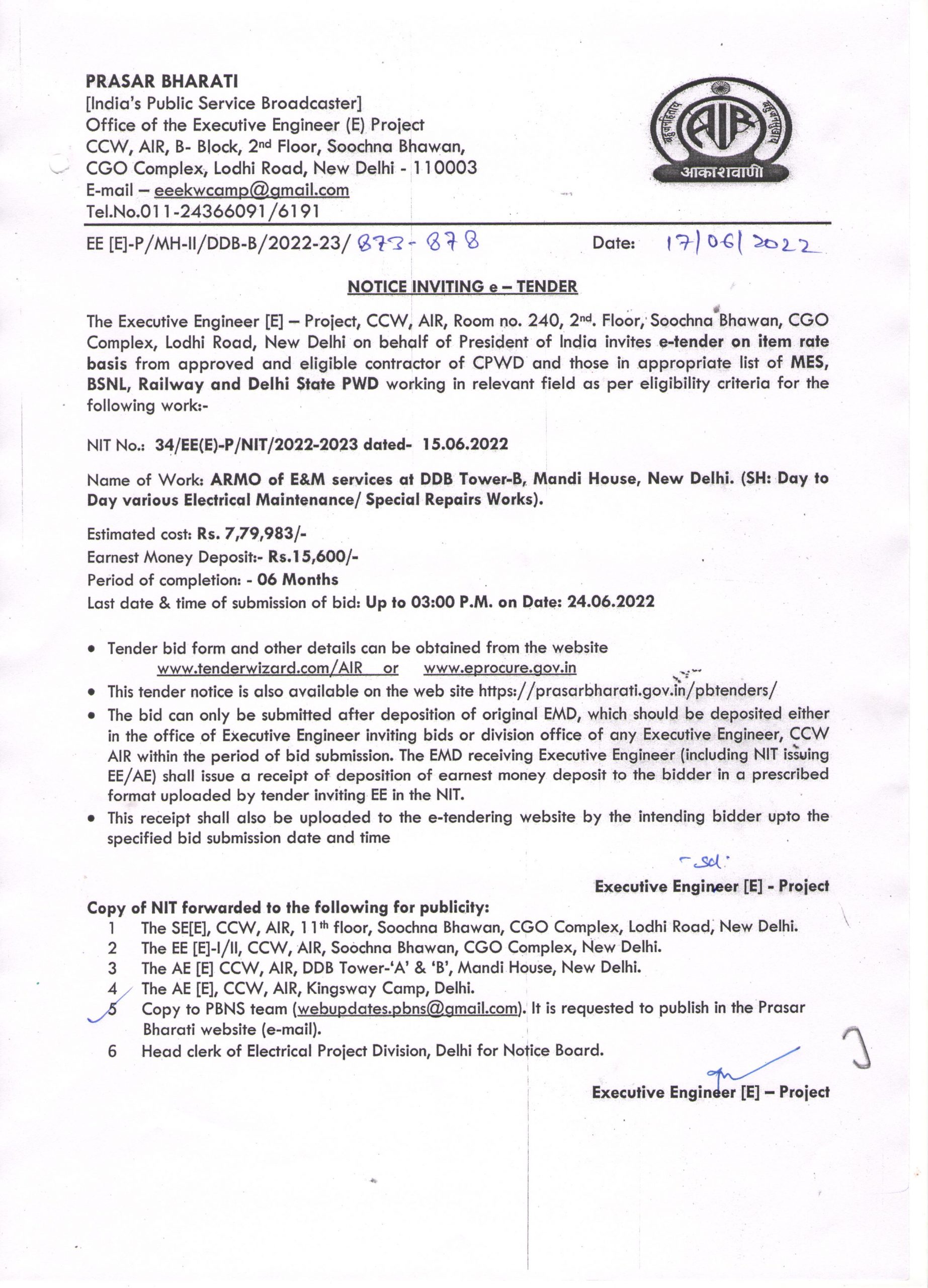 | Notice Inviting e-Tender - Routine annual maintenance of electrical & mechanical service at DDB Tower-B, Mandi House, New Delhi. (SH: Supplying & replacement feeder pillar, luminaries i/c dressing of cable at 3rd floor terrace). |