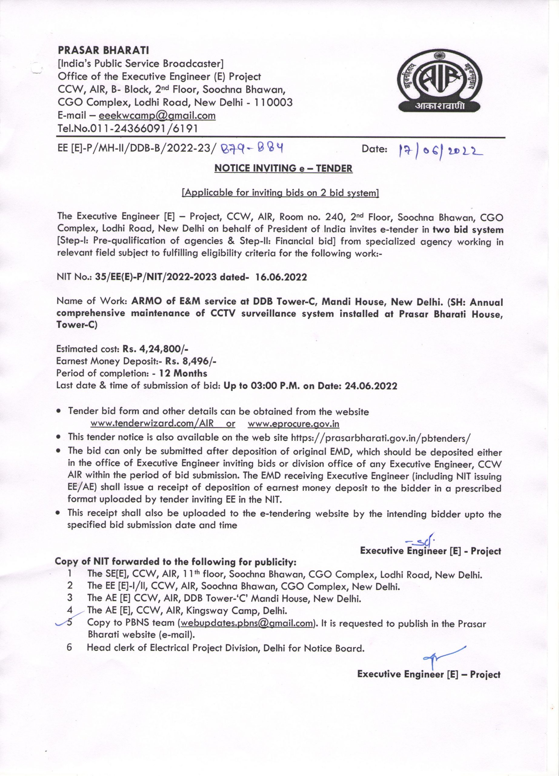 | NOTICE of 1st Extension of e-Tender (KOL/TV/1(2)/2022-23/E-Tender/AMC Elevator (Microwave Tower)/EQ-06 dated 24.05.2022) |